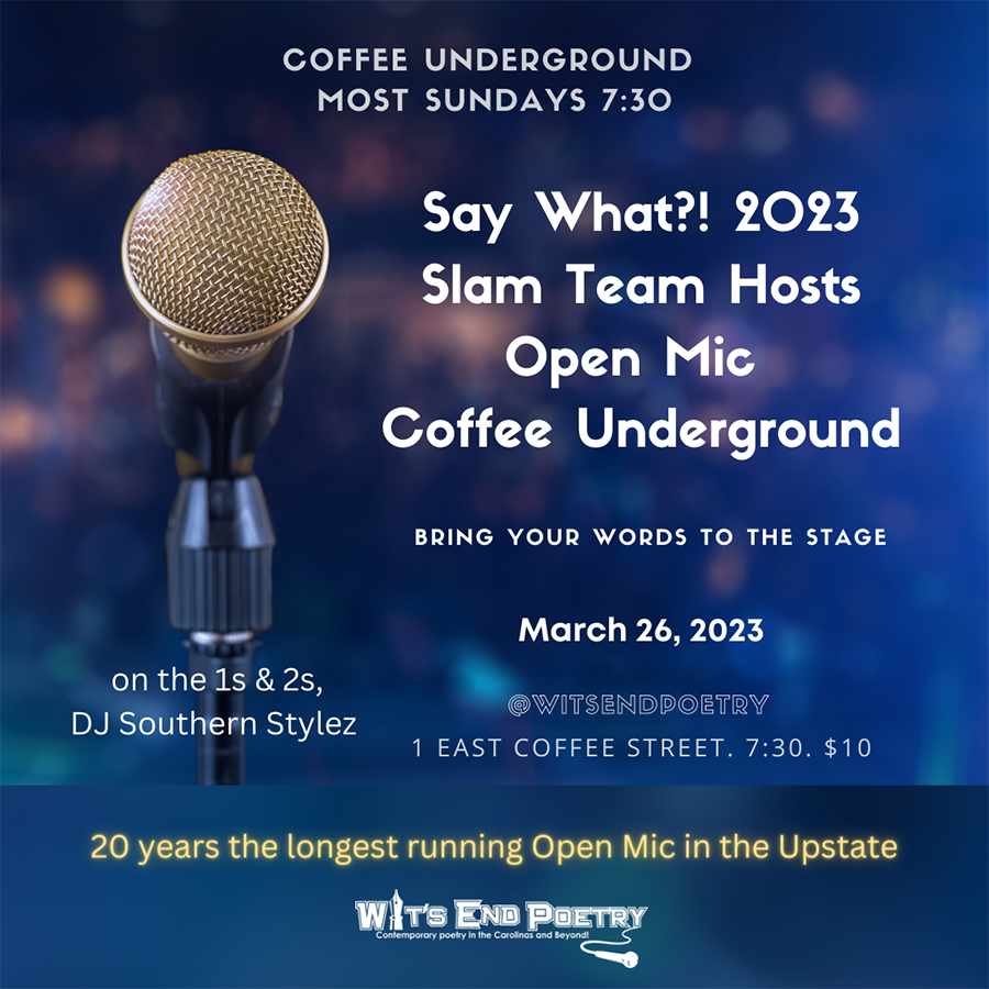 Produced by Wits End Poetry. All poetry styles welcome. Coffee Underground. 1 East Coffee Street. Greenville, SC 29601. Doors open at 7:00pm. $10.