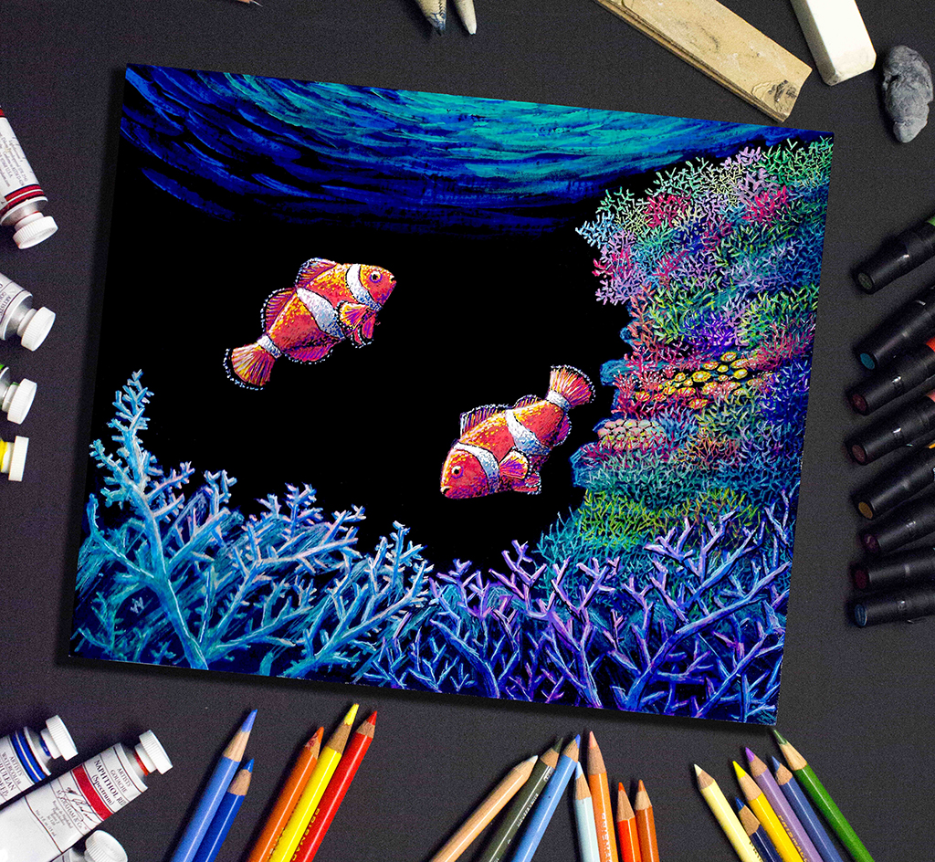 When creating my artwork, I start with choosing the person or animal I want to draw. I then either browse photography websites until I find a reference photo I really like or I draw from my imagination. From there I work on coming up with a composition and color scheme. I am constantly working towards improving my craft and furthering my skills as a fine artist. By doing this, I can improve my work and better educate my art students.