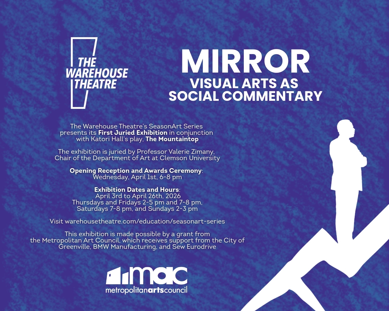 MIRROR is The Warehouse Theatre’s SeasonArt Series first juried exhibition, presented in conjunction with Katori Hall’s play THE MOUNTAINTOP.