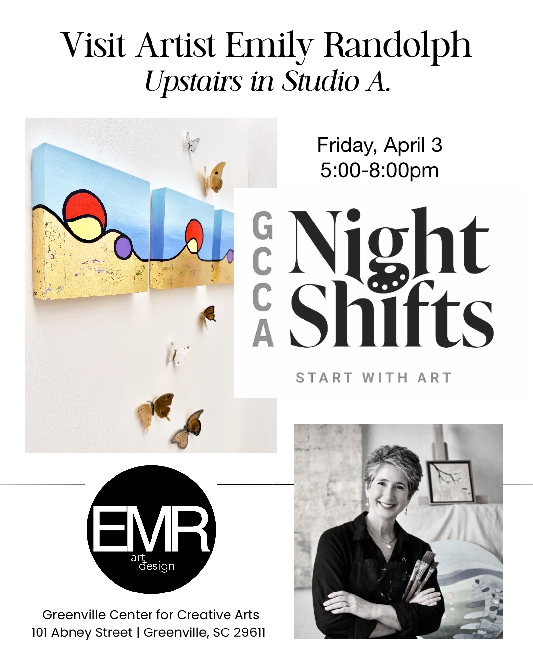 Visit mixed-media abstract artist Emily Randolph in Studio A at the Greenville Center for Creative Arts on April 3, 5-8PM during the GCCA’s Night Shift evening.