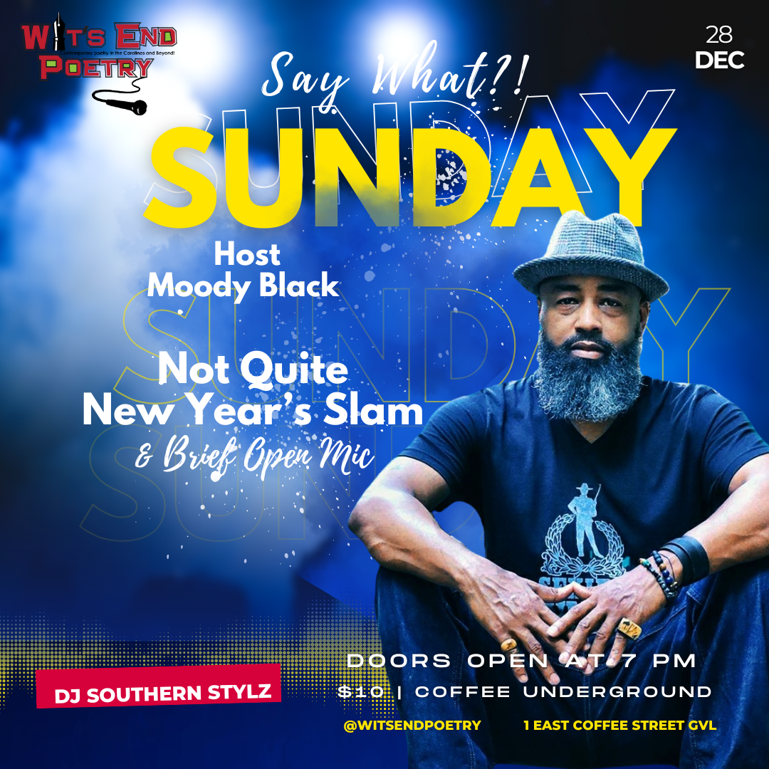 Say What?! is at Coffee Underground on Sunday! Not Quite New Year’s Poetry Slam and brief Open Mic hosted by Moody Black. All poetry styles welcome: page or stage! A fun full night of open mic slots for local poets on a first-come, first serve basis. Open mic poets may read/recite one poem and optionally share their Instagram/website.