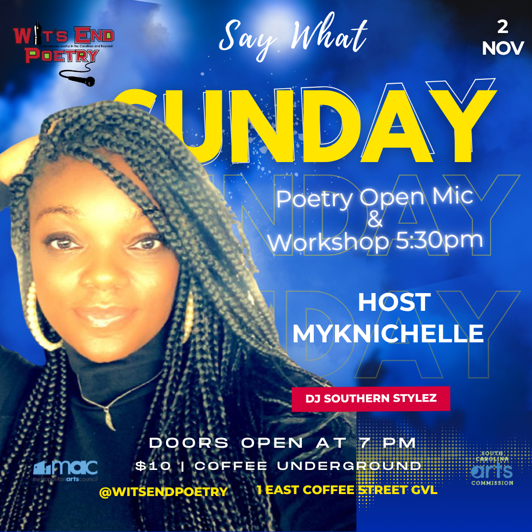 Say What?! extended Open Mic is at Coffee Underground on Sunday! Host MyKnichelle. All poetry styles welcome: page or stage! A fun full night of open mic slots for local poets on a first-come, first serve basis. Open mic poets may read/recite one poem. Writing Poetry Workshop at 5:30.