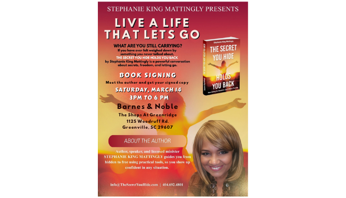 Local author Stephanie King Mattingly will host a community book signing on Saturday, March 14, from 3:00–6:00 PM at Barnes & Noble on Woodruff Road in The Shops at Greenridge. This event was previously scheduled for an earlier date and has been rescheduled due to winter weather. Her book, The Secret You Hide Holds You...